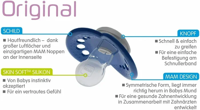 Descrizione prodotto: La tettarella simmetrica che non danneggia la mandibola è in silicone speciale MAM ed è molto più morbida. Scudo simmetrico che permette al ciuccio di stare sempre perfettamente in bocca. Ampi fori per l’aerazione delicati sulla pelle e scudo arrotondato con rilievi sul lato interno. Facile da afferrare. Vari design e colori per portare un po’ di vivacità nella vita quotidiana del bambino. Il ciuccio Perfect della MAM per bambini da 16 mesi rispetta la norma EN 1400 ed è naturalmente privo di BPA. La confezione contiene: 2 pezzi con motivo calcio