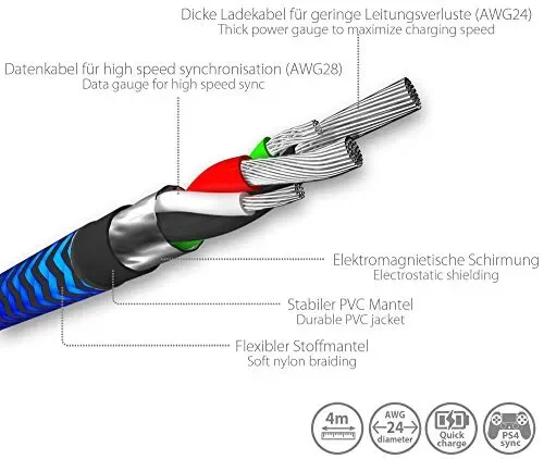 Taglia:4 metri | Colore:2 x Cavo da USB a Micro USB, nero-blu 2 x 4 metri 2.0 High Speed Micro USB dati e cavo di ricarica ad alta velocitàGli eleganti e robusti cavi di ricarica PAXO sono adatti ai controller PS4, alle telecamere, ai tablet, agli smartphone e a vari altri dispositivi.È possibile collegare comodamente una distanza fino a 4 metri tra la console o il computer e il dispositivo finale. La grande sezione del filo nel cavo consente elevate velocità di carica anche a questa lunghezza e rende il cavo molto robusto contro la rottura del cavo a causa di piegamenti, piegature o calpestio.La guaina in tessuto intrecciato e le spine in alluminio conferiscono al cavo USB un design elegante.CaratteristicheAdatto ai controller PS4 e a tutti i comuni dispositivi con presa Micro USBCavo flessibile a filo sottile 4m USB di ricarica e cavo datiMassima velocità di carica grazie alla grande sezione del cavo AWG24Design molto robusto con schermatura esterna, guaina intrecciata di alta qualità e robuste spine placcate in oroAmbito di fornitura2 x 4m cavo Micro USB con PAXO chiusura a strappo per una facile conservazione del cavo