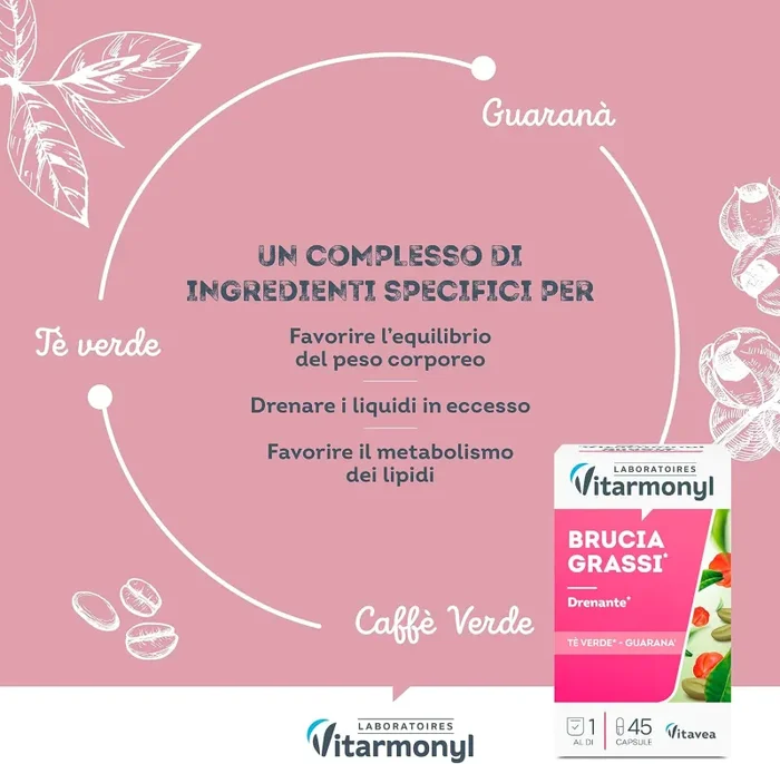 Il tè verde e il guaranà risultano utili come coadiuvanti nei regimi alimentari ipocalorici rivolti al controllo del peso. Inoltre, il tè verde può contribuire a favorire il drenaggio dei liquidi corporei. I laboratoires vitarmonyl hanno selezionato estratti di piante titolati per garantire una formulazione altamente concentrata.
