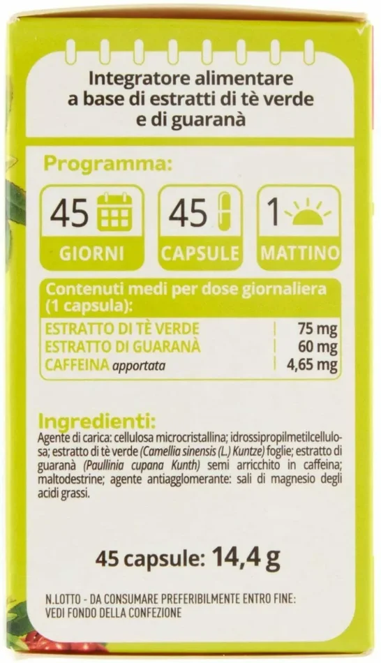 ntegratore alimentare a base di estratti di tè verde e di guaranà. agente di carica: cellulosa microcristallina; gelatina alimentare di pesce; maltodestrine; estratto di tè verde (camellia sinensis l. kuntze)foglie; estratto di guaranà (paullinia cupana h.s.k.) semi;agente antiagglomerante: sali di magnesio degli acidi grassi. contenuti medi per dose giornaliera (2 capsule): estratto di tè verde: 75mg estratto di guaranà: 60mg caffeina apportata: 7.05mg avvertenze: non superare le dosi consigliate. conservate in un luogo fresco e asciutto, tenere fuori dalla portata dei bambini di età inferiore ai 3 anni. non assumere in gravidanza, il prodotto non sostituisce una dieta variata, deve essere impiegato nell’ambito di una dieta ipocalorica adeguata seguendo uno stile di vita sano con un buon livello di attività fisica. se la dieta viene seguita per periodi prolungati, superiori alle tre settimane, si consiglia di sentire il parere medico. contiene caffeina (7,05mg/dose), non raccomandato per i bambini durante la gravidanza e l’allattamento.