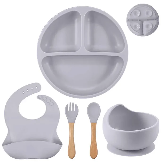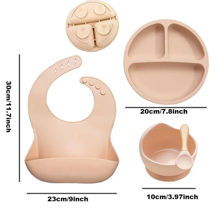 5pcs/set Ciotola In Silicone Per Bambini Con Ventosa, Set Di Forchette E Cucchiai In Legno, Set Di Bavaglini Impermeabili, Set Di Stoviglie Per L’addestramento Dei Bambini A Mangiare E Alimentarsi Al Tavolo