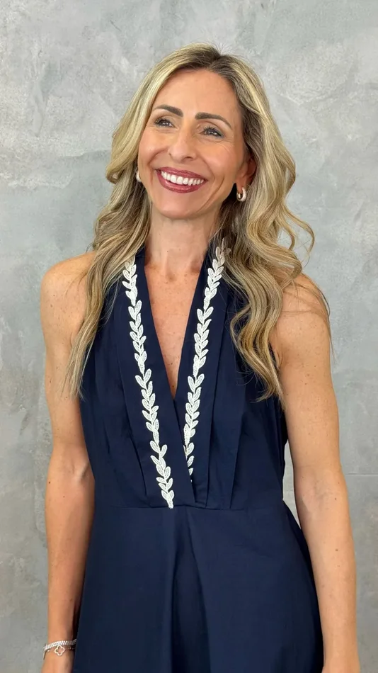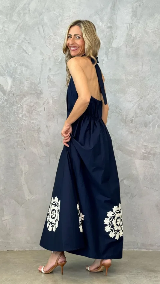 Abito con scollo all’americana con fiocco dietro al collo, eleganza e femminilità senza tempo… Meraviglioso il ricamo di soli geometrici sul fondo e di foglie sullo scollo.