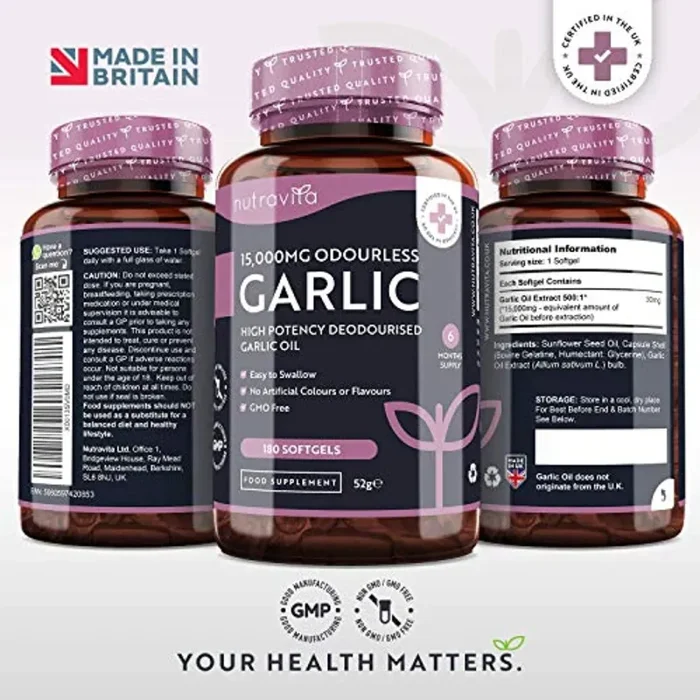 Aglio Inodore Capsule 15.000mg – 180 Softgels AltoDosaggio – Fornitura di 6 Mesi – Estratto di Olio di Aglio Puro ad Alta Qualita Deodorizzato Ricavato dall’Allium Sativum – Prodotto da Nutravita