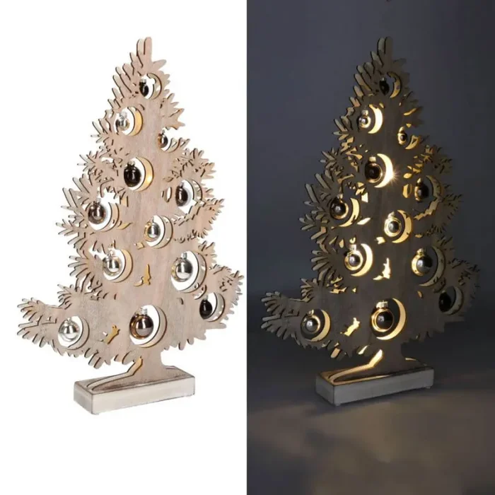 Albero di Natale in Legno 50 cm con Led e Palline Sbiancato
