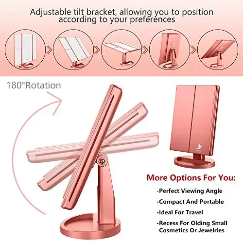 Ammiy Specchio per Il Trucco con Luce 1x / 2X / 3X Trifold ingrandente con LED Touch Screen Luci e Ricarica USB, Supporto Regolabile a 180 Gradi per Specchio cosmetico per Il Trucco – Oro Rosa