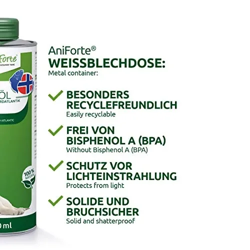 - OLIO DI SALMONE AD ALTO VALORE: Puro olio di salmone norvegese (1 litro) in un pratico barattolo di latta. In questo modo l’olio di salmone di alta qualità è protetto in modo ottimale dalla luce e dalle influenze ambientali. La lattina di latta è priva di bisfenolo A (BPA). Lo stagno è particolarmente facile da riciclare e protegge l’ambiente