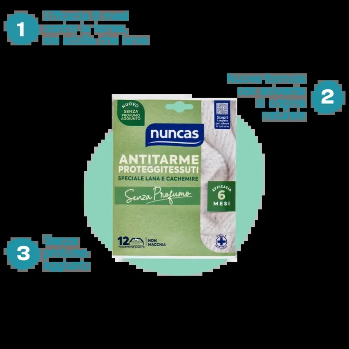 Antitarme Proteggitessuti Senza Profumo protegge i tuoi capi per ben 6 mesi dal fastidioso problema delle tarme! La nuova formula con solvente di origine naturale e la profumazione arricchita da pregiati oli essenziali garantiscono una protezione totale.