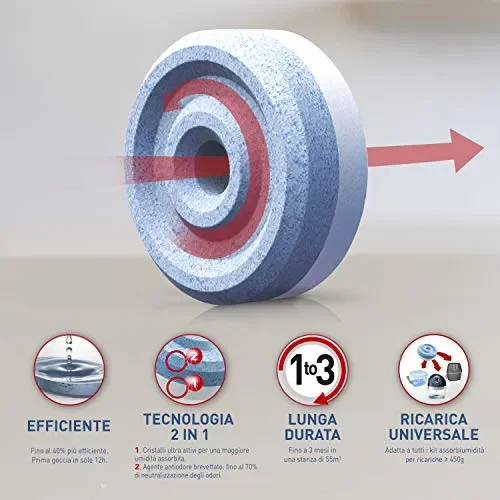 Descrizione Prodotto Leggi di più Se conosci il sistema migliore… Se hai provato Aero 360°, hai già testato con mano la sensazione di vivere in una casa priva di umidità. Ti puoi scordare condensa e cattivi odori nelle stanze e sui vestiti. …vuoi anche la sua rivoluzionaria ricarica! Il segreto dell’efficacia di Aero 360° consiste nella sua ricarica in tab ultrassorbente. Con la sua tecnologia 2in1 (assorbiumidità e antiodore), la ricarica tab è efficace nel combattere i cattivi odori e lo sviluppo di acari della polvere e della muffa, assorbendo l’umidità in eccesso. Come funziona? Il sistema Aero 360° assorbe l’umidità in eccesso Le ricariche tab con cristalli ultra-assorbenti e tecnologia anti-odore brevettata trasformano l’umidità in una soluzione salina La soluzione salina viene raccolta in un’apposita vaschetta Leggi di più Sistema di nuova generazione di assorbiumidità Efficacia potenziata La ricarica Aero 360° ha una speciale scanalatura e un foro centrale per un maggiore contatto tra l’aria e la tab. Tecnologia 2in1 1. Cristalli ultra-attivi per un assorbimento maggiore dell’umidità. 2. Agente anti-odore brevettato fino al 70% di neutralizzazione degli odori. Effetto immediato Dal momento in cui si posiziona la ricarica nel dispositivo, la prima goccia compare dopo 12h. Lunga durata Efficace fino a 3 mesi in una stanza di 20m2. Non dovrai preoccuparti di cambiare la tab per molto tempo. Leggi di più Step 1 Esercitare una leggera pressione sul simbolo “open” in alto dello sportellino. Step 2 Estrarre la ricarica dalla confezione evitando contatti con la pelle. Step 3 Inserire la tab nel kit, posizionando la parte in blu verso il basso. Step 4 Quando la ricarica si sarà esaurita, aprire il tappo e versare la soluzione salina nel WC. Leggi di più Domande frequenti ▸ Dove devo posizionarlo in casa? Per garantire una circolazione ottimale dell’aria, posizionare il kit ad almeno 10cm dalle pareti. Evitare di posizionare il dispositivo vicino a fonti di calore per non compromettere le performance. ▸ Dopo aver messo la tab, quando vedo i primi risultati? Dipende dall’umidità presente nell’aria, ma generalmente tra le 12 e le 24 ore. ▸ Quanto spesso devo svuotarlo? E’ necessario svuotarlo quando la vaschetta è piena o la tab si è completamente consumata. ▸ Come smaltisco il liquido? Quando la tab è completamente esaurita, aprire il tappo di svuotamento e versare il contenuto nel wc. ▸ E’ sicuro utilizzarlo in stanze dove dormono animali e bambini? Sì, ma dovrebbe essere tenuto fuori dalla loro portata. ▸ Le ricariche funzionano sui furgoni e auto? Funziona in furgoni e roulotte, ma non è molto efficace nelle automobili. ▸ Le ricariche sono compatibili per qualsiasi dispositivo? Le tab sono universali e adatte a tutti gli apparecchi assorbiumidità (con ricariche da min. 450g). ▸ Da dove proviene l’umidità in eccesso? L’aria può contenere una certa quantità di acqua. La condensa è segno di umidità in eccesso, soprattutto nelle aree più fredde della casa. L’umidità può entrare in casa sia dall’esterno sia dall’interno. Leggi di più