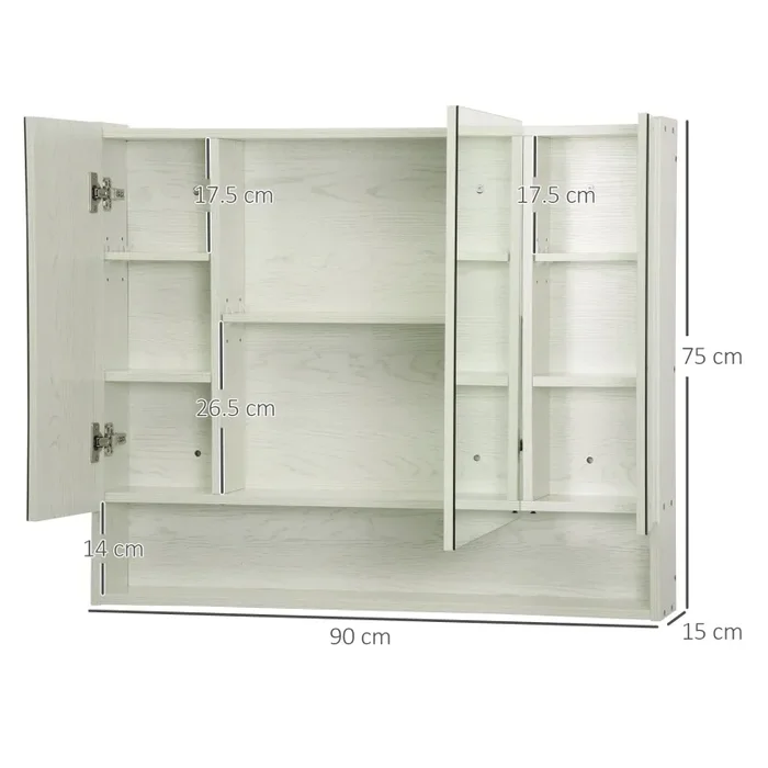 Armadietto a Specchio per Bagno con Ripiani Regolabili 3 Porte e Mensola 90x15x75 cm Bianco