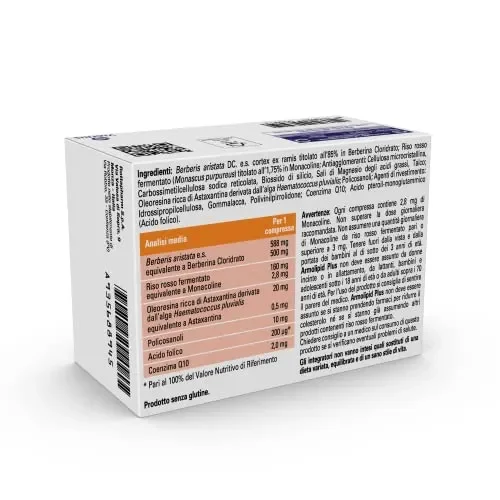 Ogni compressa contiene 2,8 mg di Monacoline. Non superare la dose giornaliera raccomandata. Non consumare un quantitativo giornaliero pari o superiore a 3 mg di Monacoline da riso rosso fermentato. Tenere fuori dalla vista e dalla portata dei bambini al di sotto dei 3 anni di età. Armolipid Plus non deve essere consumato dalle donne in gravidanza o in allattamento, da lattanti, bambini e adolescenti di età inferiore ai 18 anni e dagli adulti di età superiore ai 70 anni. Per l’uso del prodotto si consiglia di sentire il parere del medico. Armolipid Plus non deve essere consumato se si assumono medicinali per abbassare il colesterolo. Armolipid Plus non deve essere consumato se già si consumano altri prodotti contenenti riso rosso fermentato, né se altri integratori alimentari contenenti esteri di astaxantina sono assunti lo stesso giorno. Consultare un medico sul consumo di questo prodotto se si manifestano problemi di salute. Gli integratori alimentari non vanno intesi quali sostituti di una dieta variata, equilibrata e di un sano stile di vita.