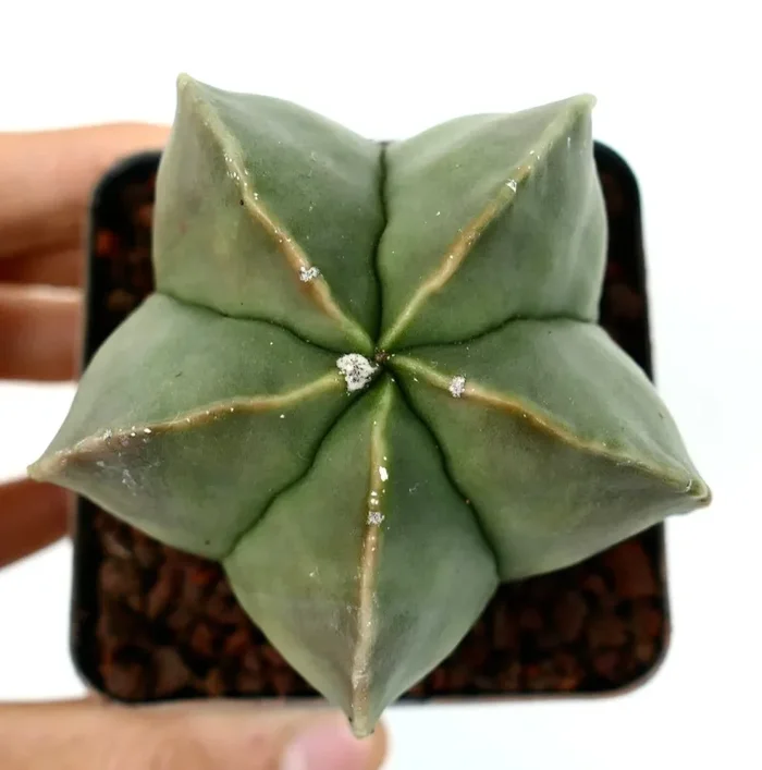 L’Astrophytum myriostigma nudum, conosciuto come cappello del vescovo, è un cactus senza spine con fusti lisci e di colore verde o verde-bluastro, suddivisi in 4-5 costole. A differenza dello Astrophytum myriostigma standard, questa varietà nudum è priva dei caratteristici tricomi bianchi (piccole strutture simili a peli) che gli conferiscono un aspetto puntinato, risultando in un’estetica pulita e uniforme. Da adulto, assume una forma a stella. In primavera ed estate, produce fiori gialli simili a margherite sulla sommità delle costole. È un cactus a crescita lenta che aggiunge un tocco di eleganza a ogni collezione.