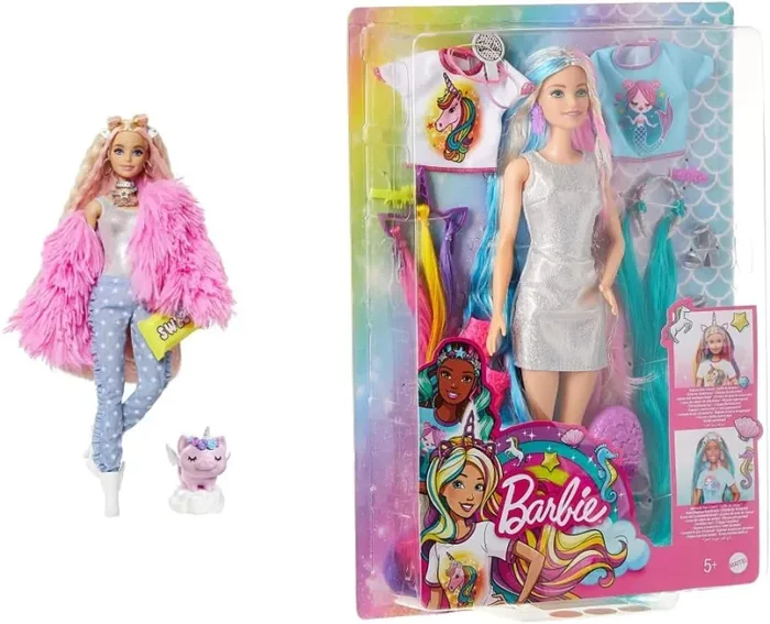 Barbie Extra n.3 – Bambola Snodata con Pelliccia Rosa e Maialino-Unicorno – 15 Accessori – Look Fashion con Ciocche Rossa – Regalo per Bambini 3+ Anni
