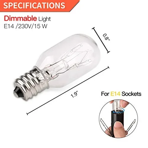Taglia:15 Watt QUALITÀ QUALITÀ E QUALITÀ Sappiamo per certo quanto sei infastidito quando la lampadina viene bruciata. La lampadina della serie di sostituzione Betus Origianl batte tutti i concorrenti sul mercato. SVILUPPATO SOLO PER LAMPADA SALE Le dimensioni della lampada sono 1,9 “x 0,8”. La giusta misura per adattarsi a tutte le lampade al sale dell’Himalaya. (ALCUNE ALTRE LAMPADINE POSSONO ESSERE TROPPO GRANDI PER NON ADATTARSI IN LAMPADE DI SALE PIÙ PICCOLE.) CONFEZIONE DI VALORE Contiene 12 lampadine di ricambio originali Betus DATI TECNICI Ingresso da 110 V a 220 V, 15 watt di potenza, luminosità dimmerabile, presa E14 (presa per lampada al sale standard) GARANZIA Siamo in piedi dietro i nostri prodotti! Una garanzia di sostituzione GRATUITA PER UN ANNO si applica a tutti gli articoli venduti da BETUS. Non esitate a contattarci!