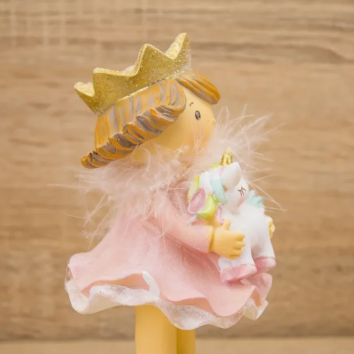 Statuina di una Bimba con Corona, piume rosa al collo e un Unicorno Piccolo, con criniera colorata, tra le mani, firmato Mandorle by Paben.