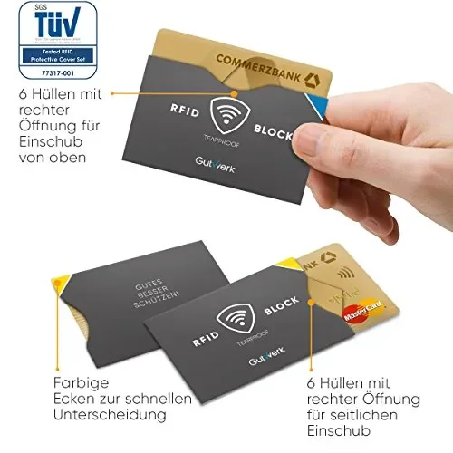 Le prime custodie protettive 100% antistrappo e certificate dal TÜV! Le 12 custodie protettive RFID di Gutwerk offrono una protezione a passo coi tempi contro il furto di dati personali e frode: Protezione certificata dal TÜV Materiale innovativo high-tech 100% antistrappo per bloccare gli attacchi RFID – basta con angoli sgualciti dopo solo due settimane come con le comuni custodie di cartoncino! Sottili e leggere, adattabili a tutti i modelli di portafogli o borsette Resistenti all’acqua Proteggetevi con le custodie RFID (anche il passaporto e le nuove carte d’identità) da brutte sorprese che possono costarvi caro. Evitate di sprecare tempo prezioso con la cancellazione dei pagamenti effettuati involontariamente attraverso carte bancarie (p. e. MasterCard o VISA) Proteggetevi dal furto d’identità! Le custodie protettive RFID (sleeve) di Gutwerk impediscono il furto elettronico d’informazioni riservate presenti sui chip delle vostre carte. Numero di conto, PIN, della patente, date di scadenza, codici di sicurezza (CSC), numeri d’identificazione (CVV) nomi, indirizzi, date di nascita e molti altri dati. I criminali usano apparecchi elettronici moderni per scansionare le vostre smartcard o il passaporto e impossessarsi delle informazioni memorizzate. Questo è possibile anche a pochi metri di distanza. Bastano pochi secondi per leggere le informazioni e per addebitare importi modesti. Le custodie protettive sono il regalo ideale per i vostri amici! Regalate sicurezza!