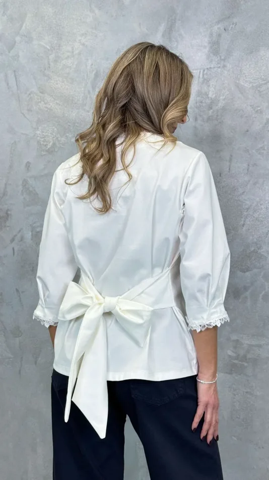 Blusa in cotone elasticizzato, scollo a V, con fiocco. Eleganti e preziose le rifiniture in pizzo sullo scollo e sulle maniche a ¾. Abbinala con un pantalone blu della nuova collezione di Sottotetto per sentirti davvero chic.
