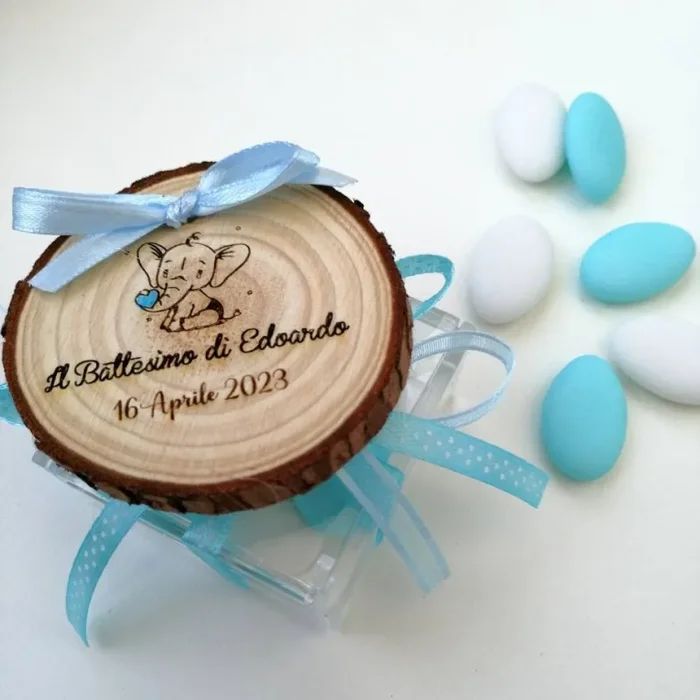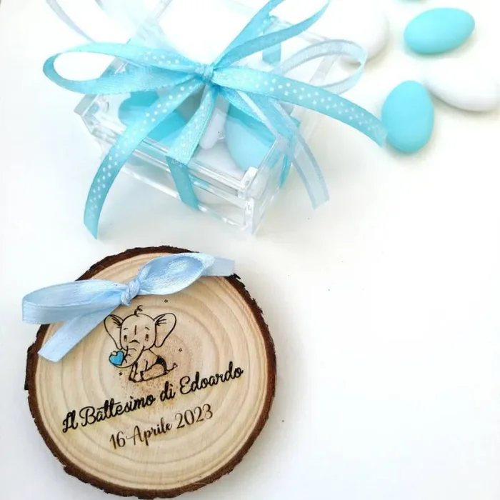 Bomboniera Battesimo in legno calamita tronchetto diametro 5cm personalizzabile confettata nascita/battesimo/compleanno