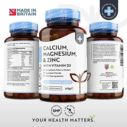 Calcio Magnesio Zinco e Vitamina D3-365 Compresse Vegetariane – Integratore di Calcio ad Alto Dosaggio – Fornitura per 6 Mesi di Integratore Osseo – Prodotto nel Regno Unito da Nutravita