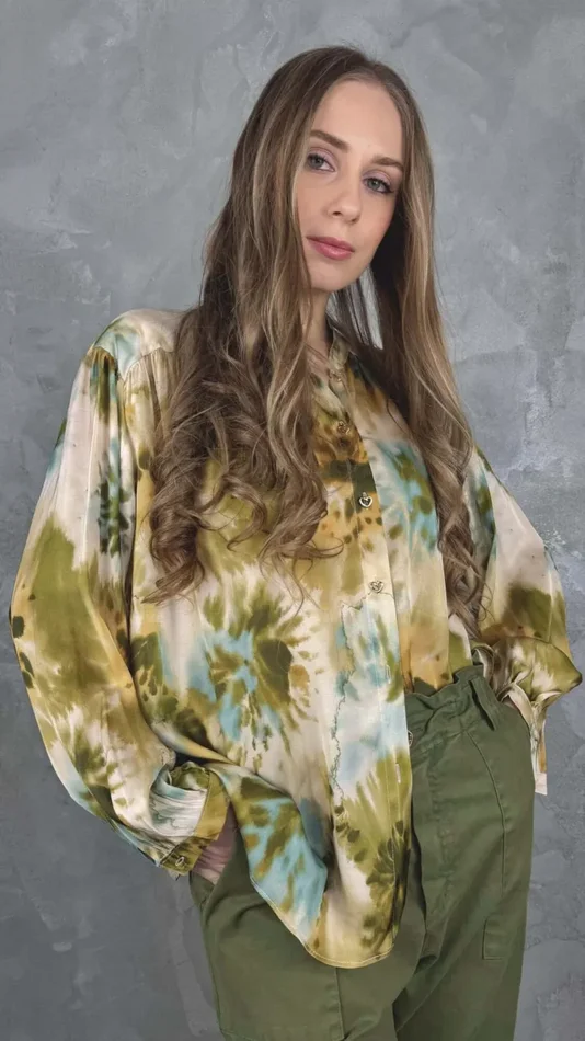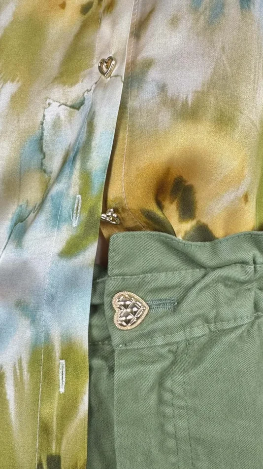 La camicia morbida con piccoli bottoncini a cuore è perfetta con il pantalone verde militare della nuova collezione.