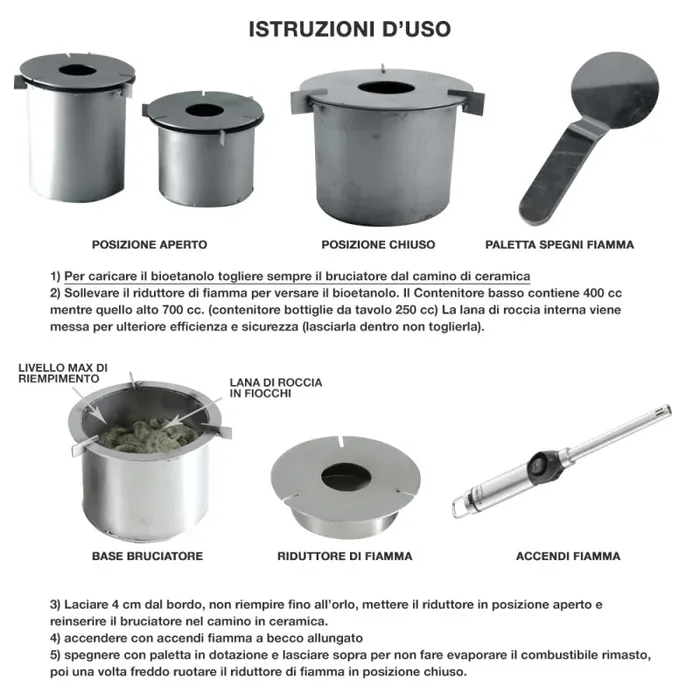 Niente di più semplice, basta versare il bioetanolo nel bruciatore e dar fuoco tramite un accendino piezoelettrico (quelli lunghi da cucina).