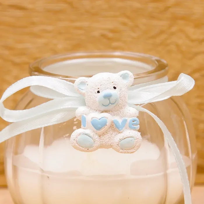 Portacandele in Vetro con applicazione di un fiocchetti in raso Celste e di un Orsetto in resina bianca con particolari in Celeste e tra le zampe ha la scritta LOVE.