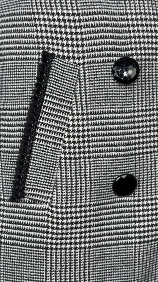 Cappotto doppiopetto foderato con quattro bottoni, fantasia check bianca e nera, tascone a filo rifinite con passamaneria di piccole frange nere.