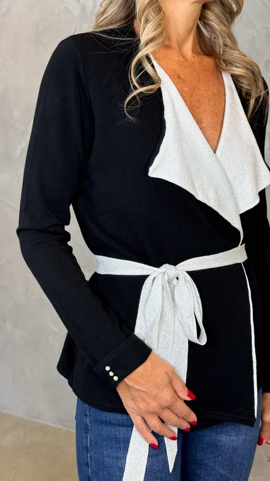 Cardigan aperto con cinta, morbido e confortevole il fit, rever in tessuto Lurex e micro perline sui polsini. Perfetto con il jeans trombetta della collezione AI 24/25.