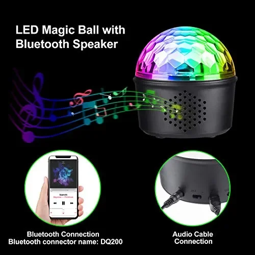 - Altoparlante Bluetooth: Altoparlante bluetooth integrato, disponibili vari di luce per la effetti luce discoteca cambiano in base al ritmo della musica, fa molti giochi luminosi sia in automatico, sia programmandola secondo i vostri gusti con telecomando, determinare i colori, la modalità di illuminazione e la velocità di rotazione.
