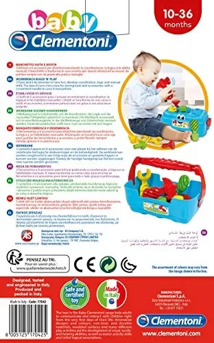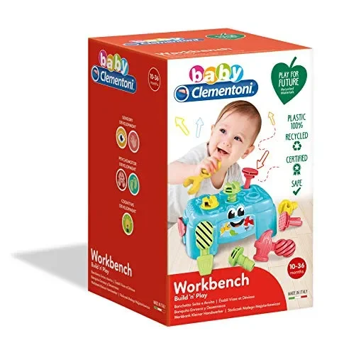 Descrizione Prodotto Leggi di più Un banchetto svita avvita come quello del papà I bambini dai 10 mesi in su impazziranno con questo banchetto svita avvita Baby Clementoni e le tante attività che si possono svolgere. Dal design e dai colori innovativi, è realizzato con materiali atossici e resistenti. Stimola la manualità e la coordinazione occhio-mano. Made in Italy. Leggi di più Un gioco 2 in 1: un banchetto e una pratica cassetta degli attrezzi Un banchetto colorato con tanti attrezzi da inserire ed estrarre per sviluppare la coordinazione occhio-mano. I bambini potranno divertirsi ad infilare i bulloni nei fori e martellare come fa il loro papà. Realizzato in plastica resistente e dotato di accessori studiati appositamente per i bambini dai 10 mesi più, è perfetto per giocare in tutta sicurezza! Il banchetto include 3 attrezzi (un martello, un cacciavite e una chiave inglese) e 6 accessori (chiodi, bulloni e viti) per divertirsi esercitando la coordinazione, la logica e le abilità manuali. L’abbinamento dei colori (chiodi rosso con il martello rosso o viti verdi con cacciavite verde) è appositamente studiato per agevolare il bambino nel gioco e per favorire l’apprendimento della relazione causa-effetto. Il banchetto, se capovolto, si trasforma in una cassetta per riporre attrezzi ed accessori, da portare sempre con sé grazie alla pratica maniglia. Leggi di più