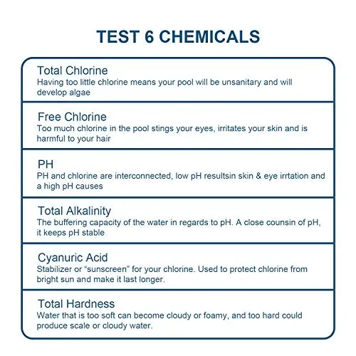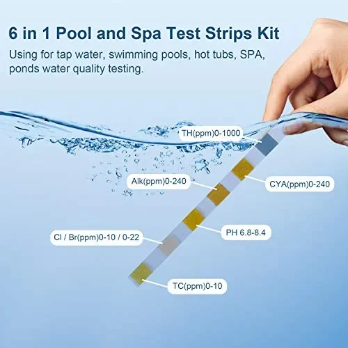 - Aggiornamento 6 in 1: strisce di prova a 6 vie per PH, cloro totale, cloro libero/bromo, alcalinità totale, acido cianurico e durezza totale.