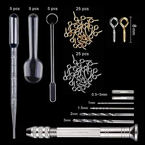 - 【Il pacchetto include】: 15 x stampi epossidici, 5 x contagocce, 5 cucchiai usa e getta, 5 x stir bar, 12 x paillettes, 1 x trapano a mano, 4 punte a spirale, 25 x unghie d’oro, 25 unghie d’argento , 1 x borsa nera