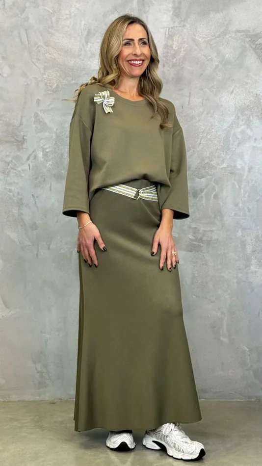 Il nuovissimo completo in “Scuba Ultra Light” primaverile di Sottotetto. Maglia girocollo con spilla, novità della gonna con elastico in vita e cinta che richiama i colori della spilla: un completo morbido, elegante che dona un comfort unico.