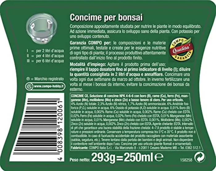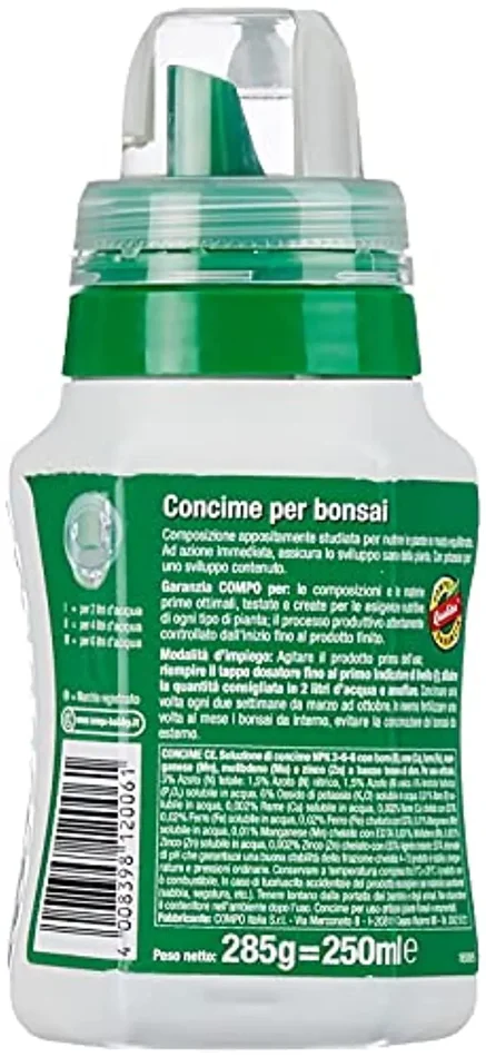 - Contenuto: 1 Flacone di Concime liquido per bonsai COMPO, Per bonsai da interno e da esterno, Con tappo graduato, Volume: 250 ml, Art; n. 1200602005