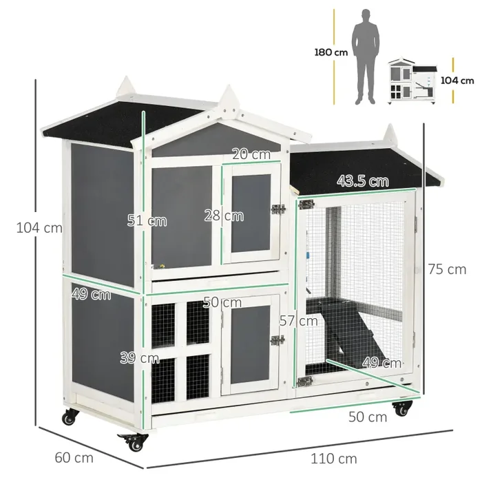 Questa conigliera è grande a sufficienza da offrire ai roditori un’area confortevole, ma abbastanza piccola da adattarsi facilmente al tuo spazio. Le ruote in dotazione rendono facile spingere la casetta per conigli, evitando così di sollevarla e fare inutili fatiche. La conigliera da esterno è realizzata in legno d’abete massiccio e tubi d’acciaio per offrirti una costruzione durevole, mentre il tetto in bitume ripara l’area dal clima caldo e umido, rendendosi adatta agli spazi esterni.