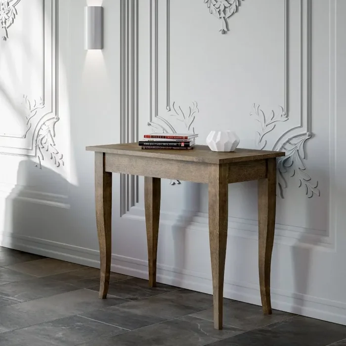 La Consolle Allungabile Classica Sciabola Small stupisce per la sua bellezza e la sua originalità, pur mantenendo uno stile classico e sempre elegante. Il Design farà la differenza a casa vostra, il legno renderà la vostra stanza raffinata e accogliente. Le gambe della Consolle Sciabola sono realizzate in legno massello di faggio mentre il piano e le allunghe sono pannelli di microparticelle di legno con utilizzo di collanti privi di formaldeide. Tuttavia, una delle caratteristiche principali della Consolle Sciabola è di essere dotata di 3 prolunghe. Tali prolunghe consentono di allungare la Consolle e ospitare quanti più amici avete voglia di invitare a casa vostra. Le prolunghe di serie misurano da 52 x 90 cm cadauna e sono comprese nel prezzo. Con questo sistema avrete la possibilità di regolare la lunghezza della Consolle sempre in base alle esigenze del momento. Le Dimensioni della Consolle Sciabola allungata: Con una prolunga Lunghezza di cm. 100, Con due prolunghe Lunghezza di cm. 152, Con tre prolunghe Lunghezza di cm. 204.La Larghezza e l’altezza rimangono sempre invariati (L. 90 x H. 77). La stabilità della Consolle Sciabola, quando completamente allungata, è garantita dal sistema di supporto centrale a 2 appoggiaterra. Tale supporto è incluso nel prezzo.