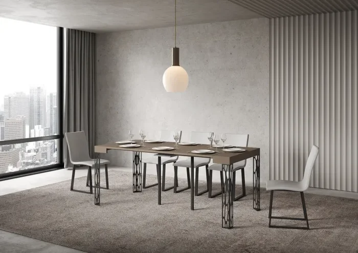 Consolle allungabile Ghibli, versatile e robusta, un complemento perfetto per ogni ambiente della casa: ingresso, cucina, sala da pranzo, soggiorno o corridoio. La consolle allungabile Ghibli può essere facilmente trasformata in un ampio tavolo da pranzo lungo fino a 300 cm, in grado di ospitare 14 persone. Realizzata con pannelli in nobilitato, gambe in ferro. Il sistema di allunghe con guide telescopiche in alluminio e il sostegno centrale in dotazione rendono la consolle stabile e robusta. Una volta che la consolle è chiusa, le allunghe devono essere riposte altrove.