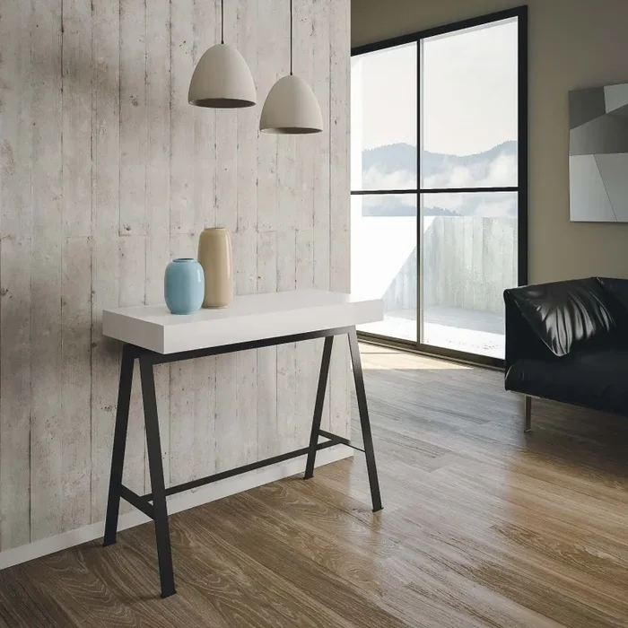Consolle Allungabile Banco Adatta per ambienti classici e moderni, ideale per chi cerca eleganza e praticità: perfetta per ogni ambiente. Banco è una Consolle allungabile estremamente versatile e di una sicura qualità. Un mobile di pregio a un prezzo imbattibile. Con poche e semplici mosse si trasforma in un comodo e spazioso tavolo da pranzo. La stabilità è garantita dalla struttura con la quale è realizzata e dal meccanismo di allunghe che permette di creare un tavolo della dimensione desiderata, a seconda delle necessità. L’ampio e solido telaio in metallo, lavorato a laser ad alta precisione, forma la struttura portante. La Consolle Banco è realizzata interamente in Italia mediante l’utilizzo di materiali 100% italiani. Composta essenzialmente da due parti: Struttura portante in metallo verniciato Piano superiore allungabile con sistema di guide in alluminio ad elevata scorrevolezza Spazioso e robusto, il piano dovrà essere supportato da due sistemi di appoggio che andranno inseriti alle estremità mediante appositi meccanismi di bloccaggio