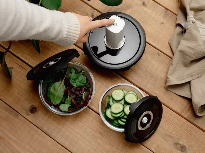 Basta premere un pulsante e la pompa sottovuoto rimuove efficacemente l’aria dal sacchetto o dal contenitore. Non devi far altro che prendere il sacchetto o il contenitore sottovuoto, inserire all’interno il cibo che vuoi mantenere fresco e lasciare che la pompa sottovuoto faccia la magia. Dopo pochi secondi, potrai riporre il sacchetto o il contenitore sottovuoto in frigo o nel freezer.