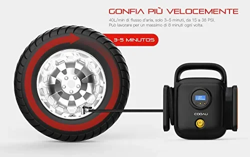 • Gonfiaggio veloce – 150PSI Valore di pressione massimo. Gonfia ad alta velocità (40L/Min). Questo compressore d’aria d’auto può gonfiare pneumatici dai 15 ai 38 psi in soli 3-5 minuti.