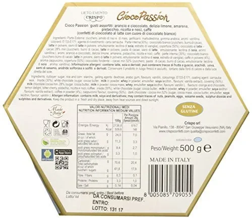 DescrizioneConfetti di cioccolato al latte ripieni di cioccolato biancoIngredientiCONFETTI DI CIOCCOLATO AL LATTE CON CUORE DI CIOCCOLATO BIANCO AI GUSTI ASSORTITI – Ingredienti: cioccolato al LATTE (50%) (zucchero, burro di cacao, LATTE in polvere, pasta di cacao, siero di LATTE, emulsionante: lecitina di SOIA, aromi: vanillina); cioccolato bianco (30%) (zucchero, burro di cacao, LATTE in polvere, siero di LATTE in polvere, emulsionante: lecitina di SOIA, estratto di vaniglia); zucchero; amido di riso e di mais, gelificanti: maltodestrina, gomma arabica; coloranti: E133 – E171; agente di rivestimento: cera carnauba; aromi: arancio e cioccolato, delizia limone, amarena, pistacchio, ricotta e noci; aromi: vanillina. Cacao 28% min. CONFETTI DI CIOCCOLATO FONDENTE E CIOCCOLATO AL LATTE CON ESTRATTO CAFFE’ CON CUORE DI CIOCCOLATO BIANCO – Ingredienti: Cioccolato Fondente e cioccolato al latte con estratto caffè (50%) (pasta di cacao, zucchero, burro di cacao, LATTE intero in polvere, LATTOSIO, caffè estratto in polvere (max 3 %), lecitina di SOIA, vanillina); cioccolato bianco (30%) (zucchero, burro di cacao, LATTE in polvere, siero di LATTE in polvere, emulsionante: lecitina di SOIA, estratto di vaniglia); zucchero; amido di riso e di mais; gelificanti: maltodestrina, gomma arabica; coloranti:E133 – E171; agente di rivestimento: cera carnauba; aromi: vanillina. Cacao min.52%Indicazioni-Avviso di sicurezza-Visualizza di più