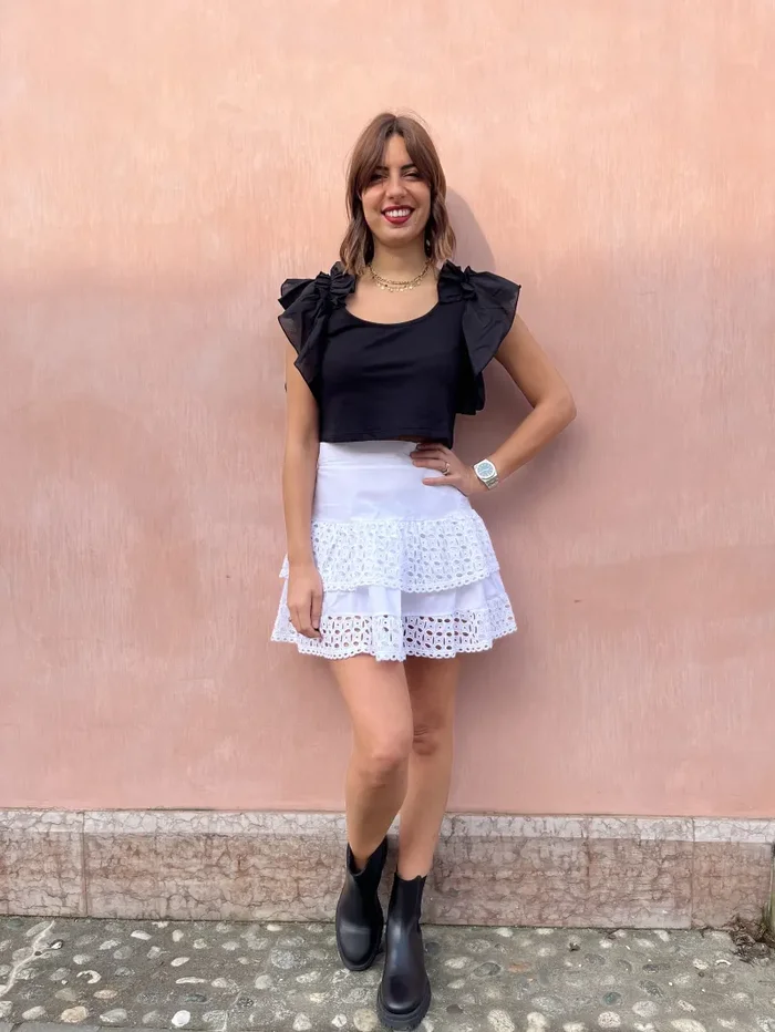 Il nostro crop tshirt è perfetto per un look estivo e di tendenza! Con una vestibilità corta e rouches sulle maniche, ti farà sentire fresca e alla moda. Combinalo con i tuoi pantaloni o gonne preferiti per un’outfit perfetto per l’estate!