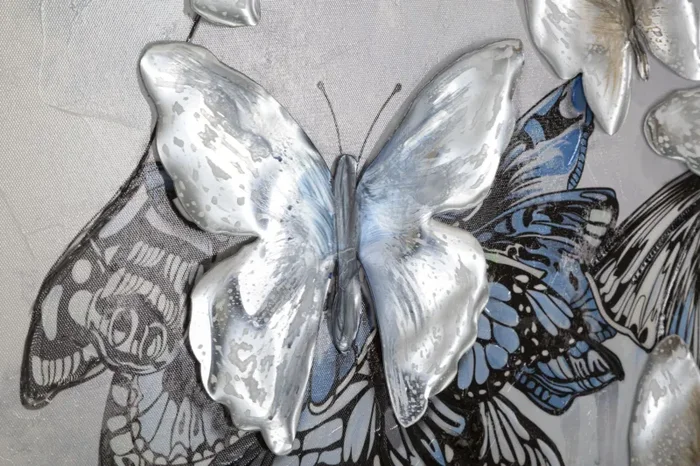 Questa rappresentazione pittorica su tela con un telaio in legno mostra una figura femminile di spalle. Il vestito della donna è molto particolare, infatti è composto interamente da farfalle in rilievo che creano un effetto tridimensionale. Questa scelta artistica conferisce un’aura di leggerezza e delicatezza all’opera, mettendo in evidenza l’eleganza e la bellezza dello stile della donna. L’uso dei colori e dei dettagli delle farfalle dona un tocco di vivacità e dinamicità all’intera composizione.