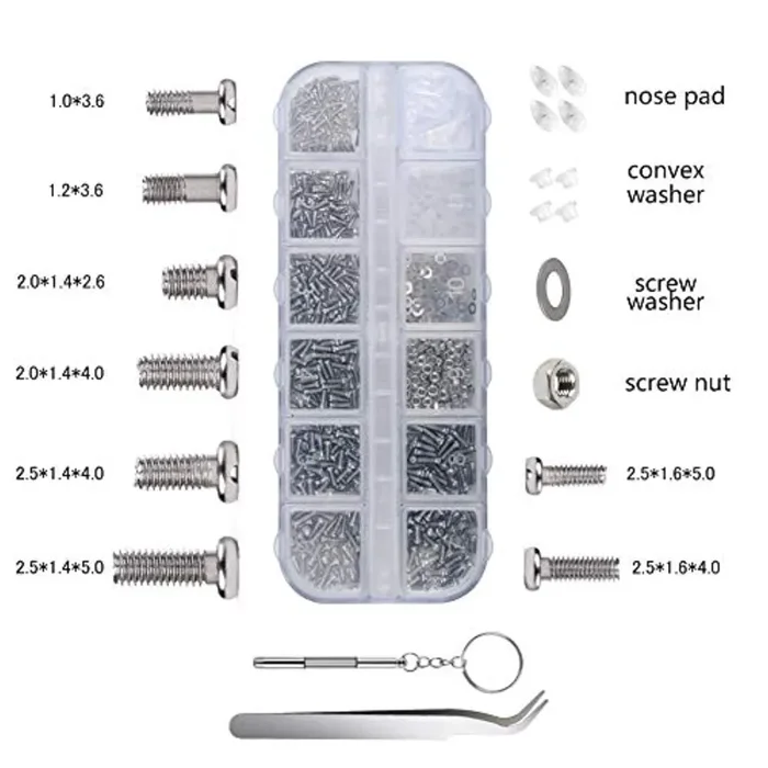 • Il kit per la riparazione degli occhiali contiene 12 diversi tipi di viti, dadi, rondelle e naselli in acciaio inossidabile. C’è sempre una taglia che corrisponde ai tuoi occhiali
