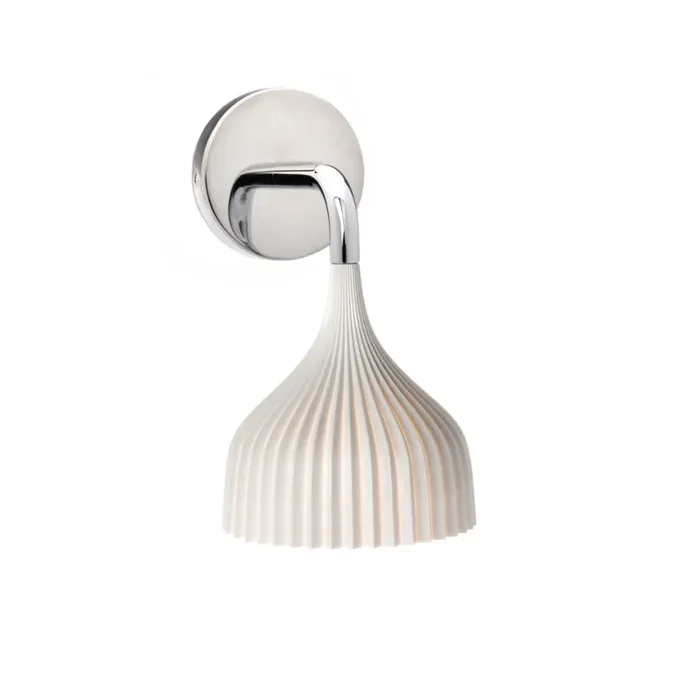 Una lampada dal design semplice ed essenziale, disponibile in due versioni: applique e sospensione. L’applique è composta da un diffusore a rosone plissettato, disponibile in più varianti colore, e un braccio in metallo cromato della lunghezza di 11 cm. La lampada É a sospensione ha il diffusore plissetato ed un rosone in metallo cromato. La fune è regolabile in altezza da un minimo di 20 cm. a un massimo di 220 cm. Per entrambe le versioni la potenza della lampada è di 40 Watt.