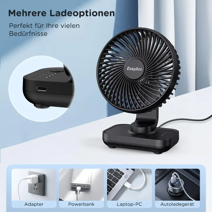 - 🌞【4000 Batteria Ricaricabile – Uso 15 Ore, Ricarica Rapida USB-C】EasyAcc ventilatore da tavolo USB-C ha una 4000 batteria ricaricabile incorporata, che ti consente di goderti fino a 15 ore di rinfresco di lunga durata. Con USB-C porta e supporta una ricarica completa rapida in 4,5 ore tramite adattatore o power bank.