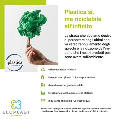 • MATERIALE: La Plastica Seconda Vita viene lavorata in modo da ottenere un materiale flessibile, difficile da rompere e durevole nel tempo. I prodotti Ecoplast spiccano sul mercato per l’ottimo rapporto qualità prezzo, il design e l’ecosostenibilità.