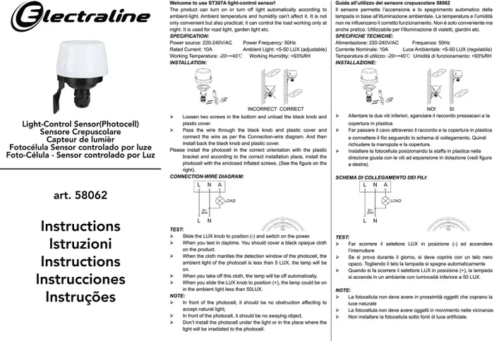 Electraline 58062 Interruttore Crepuscolare per Uso Esterno Ip44