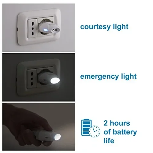 Descrizione Prodotto Leggi di più Torcia d’emergenza automatica anti black out. LUCE DI CORTESIA Quando è collegata alla corrente la torcia funge da luce notturna; i due LED laterali sono accesi ed emettono una luce leggera. LUCE DI EMERGENZA AUTOMATICAMENTE ON: In caso di black out la torcia centrale, la più potente, si accende automaticamente. TORCIA Provvista di batteria interna, permette di staccare la lucina dalla corrente ed utilizzarla come torcia di emergenza, premendo sul tasto centrale. 2 ore di batteria autonoma. Leggi di più