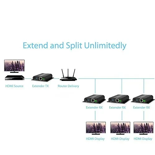 - Permette di essere Distribuito da Router o Commutatore di Rete per la Connessione in Cascata, ed essere usato come il HDMI Divisore ed Extender