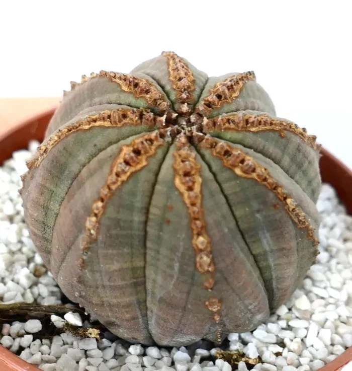 Euphorbia obesa BROWN ARROW è un’affascinante pianta succulenta senza spina dorsale della famiglia delle Euphorbiaceae. Il suo gambo sferico e costoluto ricorda una palla, mostrando una sorprendente colorazione dal verde scuro al verde-brunastro con strisce verticali più chiare. Questa pianta unica è dioica, il che significa che le singole piante hanno fiori maschili o femminili. Nel suo habitat naturale, l’Euphorbia obesa BROWN ARROW si affida alle formiche per la dispersione dei semi.